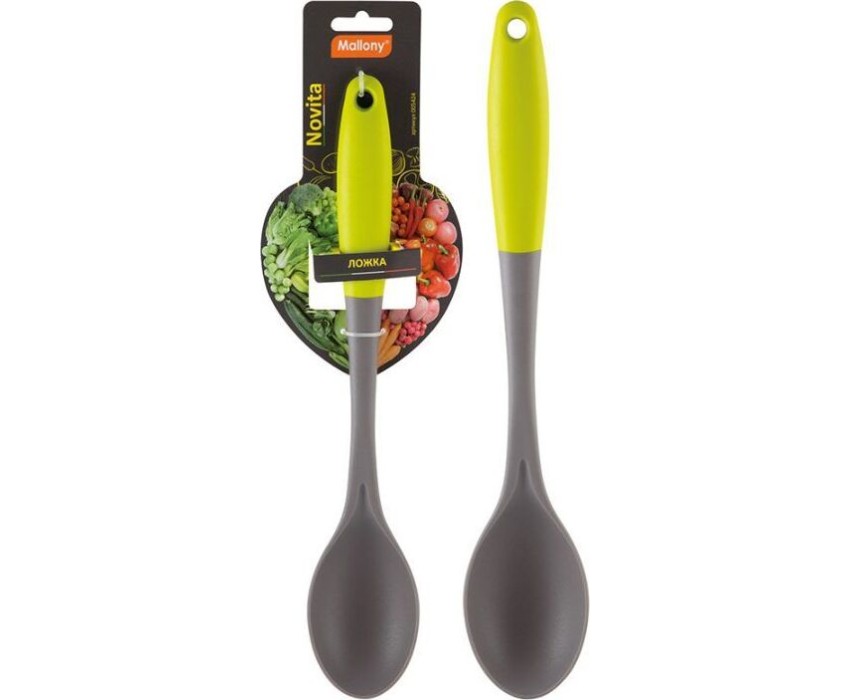 Ложка из нейлона с цветной ручкой из TPR, серия Novita, тм Mallony Цвет ручки — зеленый, цвет рабочей части — серый. Материалы: нейлон, TPR Упаковка: цветная подложка. Предназначена для помешивания блюд во время приготовления.