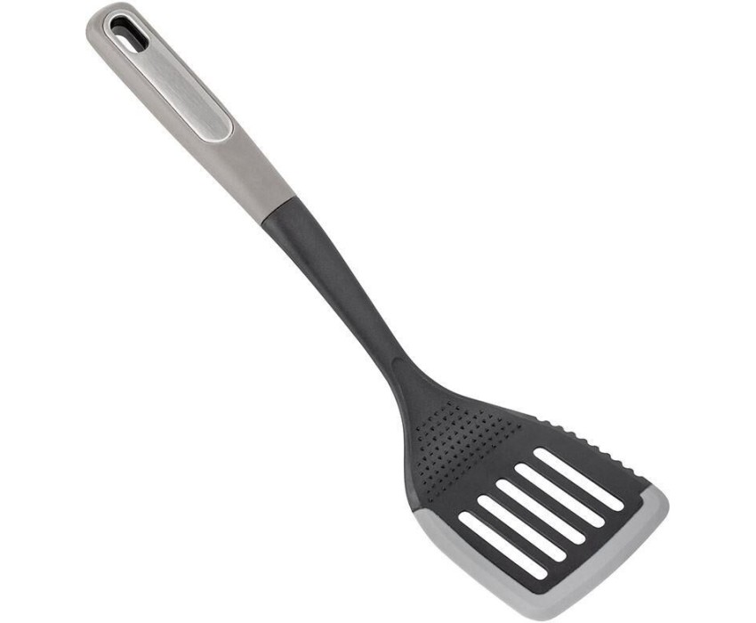 Лопатка с отверстиями CHEF из нейлона с силиконовым краем Материал: нейлон, силикон, полипропилен (ручка). Силиконовый край - защита посуды от царапин. *Край модели рифленый - предназначен для нарезки приготовленного мяса/стейков; рабочая часть дополнена тёркой для чеснока/имбиря, прочего. Картонная подложка + пакет.