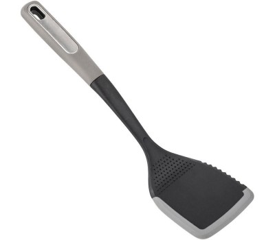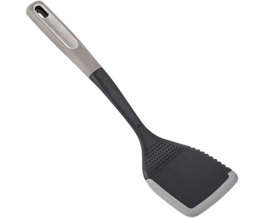 Лопатка CHEF из нейлона с силиконовым краем Материал: нейлон, силикон, полипорпилен (ручка). Силиконовый край - защита посуды от царапин. Картонная подложка+пакет. Размер: 34*8,8*4,1 см. *Край модели рифленый - предназначен для нарезки приготовленного мяса/стейков; рабочая часть дополнена тёркой для чеснока/имбиря, прочего.