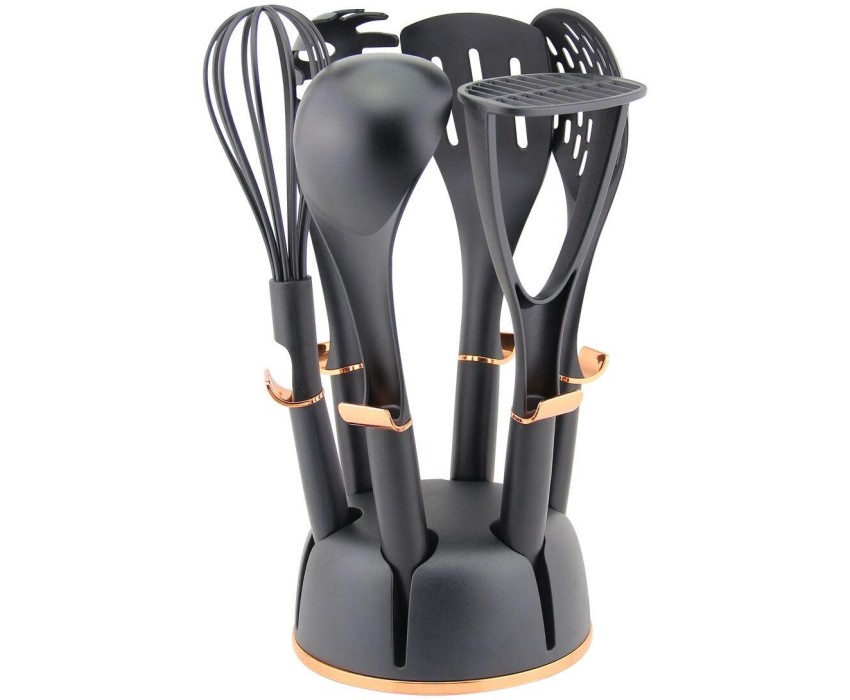 P180101 Assistenza Набор кухонных принадлежностей Pomidoro, 7 предметов. В набор входит половник, лопатка для жарки, толкушка для картофеля, ложка для спагетти, шумовка, венчик и удобная и стильная подставка для компактного хранения на кухне.