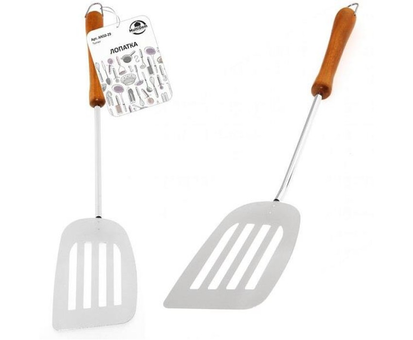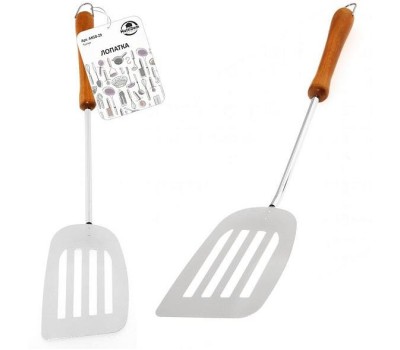 Предназначена для переворачивания готовящихся на сковороде блюд и подачи их к столу, а также для нарезки и раскладывания кондитерских изделий: пирогов, тортов и т. д. Изготовлена: рабочая часть из стали с хромированным покрытием, ручка из дерева.