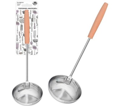 Предназначен для порционного раскладывания первых блюд, а также разливания компотов, морсов, киселей. Изготовлен: рабочая часть из стали с хромированным покрытием, ручка из дерева. Общая длина 28 см, ёмкость чаши половника 80мл.