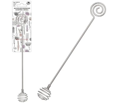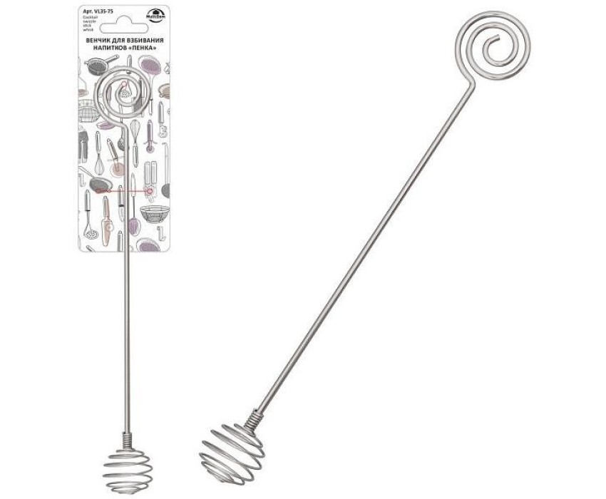 Применяется для взбивания напитков, коктейлей, кофейной пенки, яиц, а также может применяться в качестве ложки для меда. Изготовлено из коррозионностойкой (нержавеющей) стали. Общая длина 20 см.