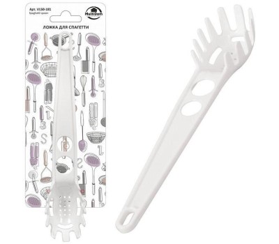 Ложка пригодится при приготовлении спагетти и других блюд. На ручке расположены специальные отверстия, с помощью которых можно отмерять определенное количество порций спагетти. Большие зубцы обеспечивают зацеп макаронных изделий, что облегчает процесс приготовления. В центре ложки предусмотрены отверстия для слива лишней жидкости. Изготовлено из пластмассы (полипропилен). Размер: общая длина 26,5 см.