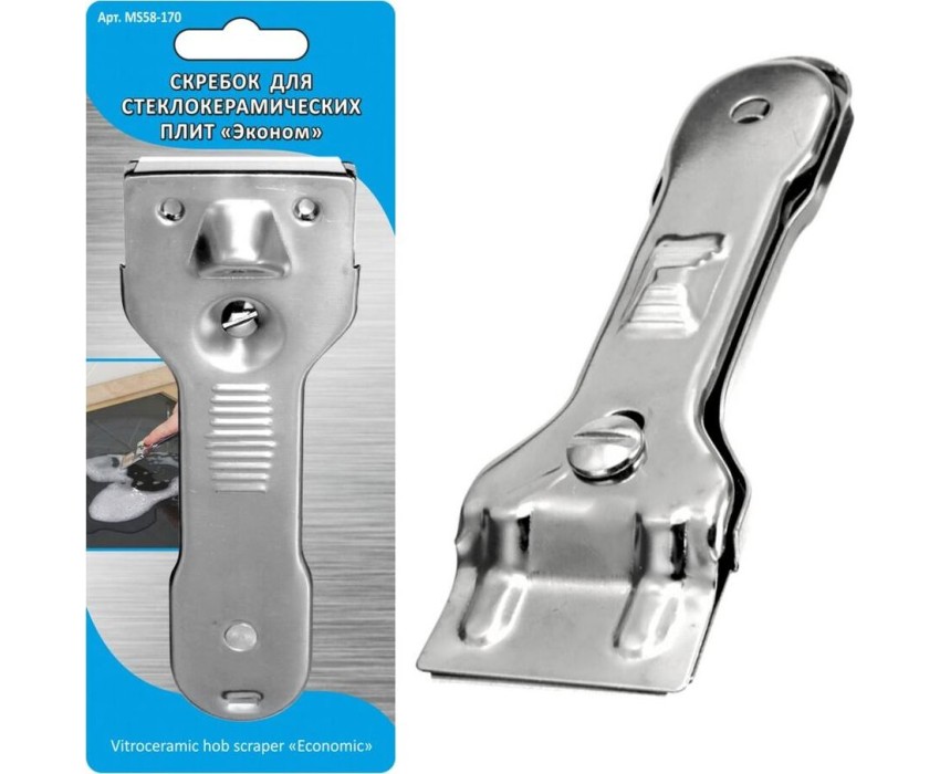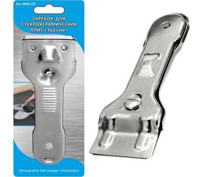 Скребок д/стеклокерам. плит "Эконом" MS58-170 Материал: Металл (Нерж.сталь) Размеры: скребок 13.5х4.4 см, лезвие 4.3х2.2 см.