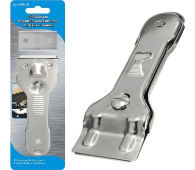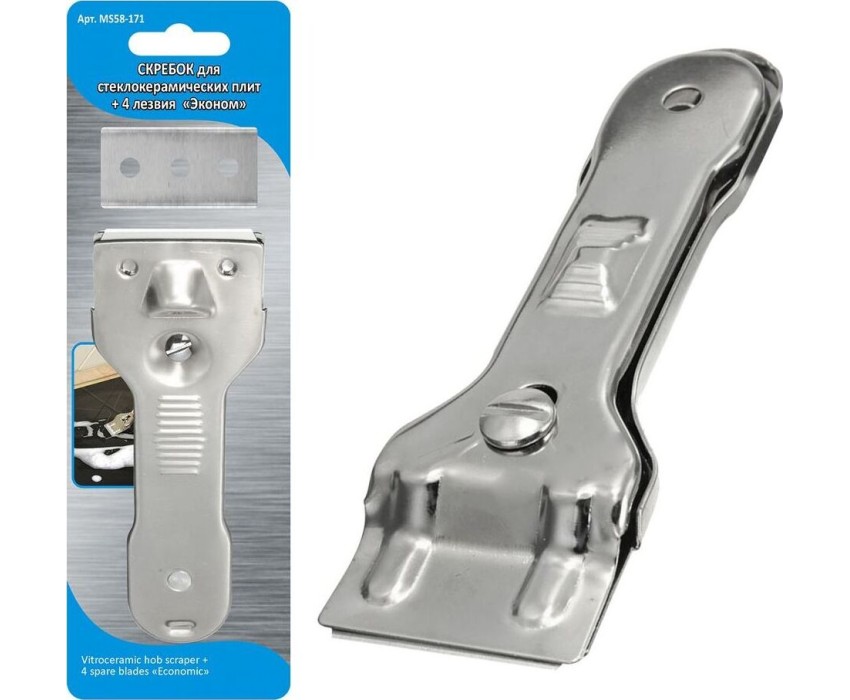 Скребок д/стеклокерам. плит + 4 лезвия "Эконом" MS58-171 Материал: Металл (Нерж.сталь) В комплект входит 4 двусторонних лезвия. Размеры: скребок 13,5х4,5 см, лезвие 4,3х2,2 см.