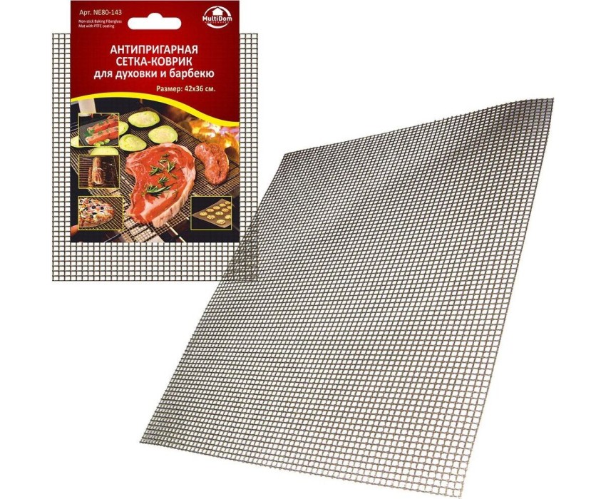 Антипригарная сетка - настоящая находка для хозяйки. Это приспособление защитит поверхность решётки для барбекю или противня от пригорания, позволит приготовить здоровую пищу без использования масла или жира. Сетка способствует циркуляции воздуха, что позволяет добиться хрустящей корочки во время запекания или жарки. Приготовленные блюда не пригорают и легко снимаются с сетки. Жаростойкость - до 260 °С. Сетка рассчитана на многоразовое использование, практична и проста в уходе. Перед первым применением и после каждого использования рекомендуется вымыть губкой или мягкой щёткой, можно с жидким моющим средством, сполоснуть проточной водой и просушить. Можно мыть в посудомоечной машине. ВНИМАНИЕ Не режьте приготовленные блюда ножом на сетке. Не используйте абразивные материалы и жёсткие щётки. Изготовлено из тефлона, армированного стекловолокном. Размер 42х36 см.
