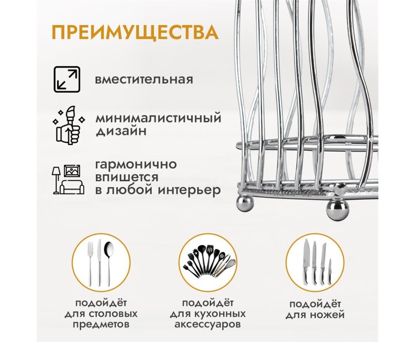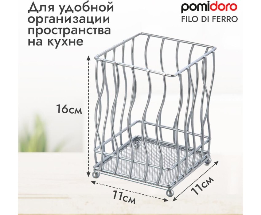 P270023 Filo di ferro Подставка для столовых приборов. Предназначена для удобного хранения столовых приборов. Идеально впишется в интерьер современной кухни. Материал проволока. Размеры 11*11*16см.
