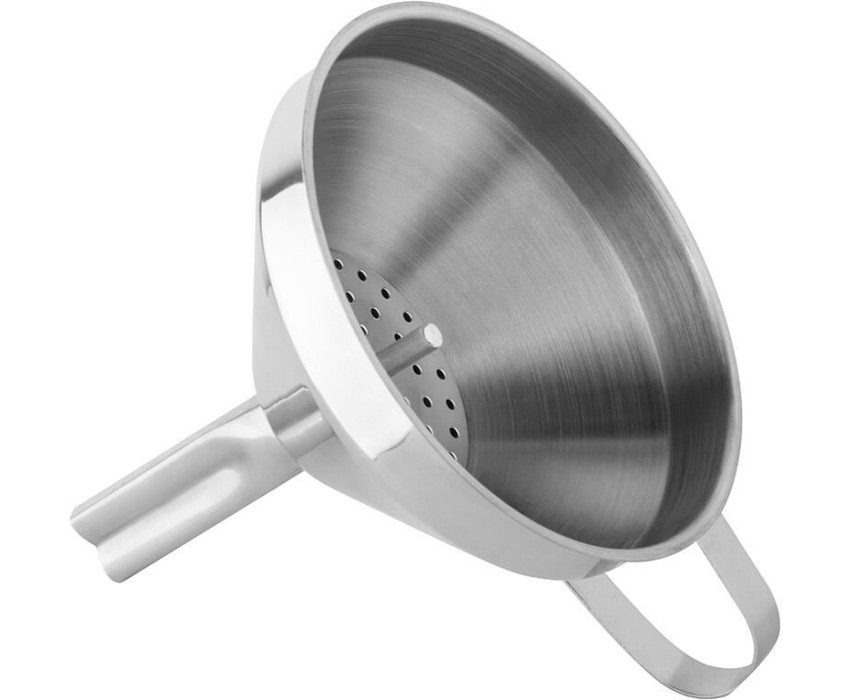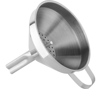 Воронка с фильтром, Domestico, размер: 10,5*13*10,5 см, из нержавеющей стали. Материал: нерж сталь, толщина 0,5 мм. Снаружи: зеркальная полировка. Внутри: матовая полировка. Эргономичная ручка - для удобства использования. Пакет с подвесом + стикер.