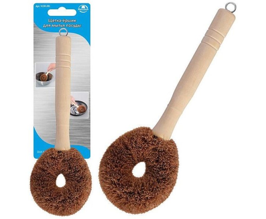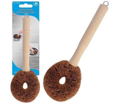 Щетка-ершик для мытья посуды поможет вам тщательно очистить поверхность от застаревшего жира, нагара, ржавчины со дна сковородок, кастрюль и кухонных поверхностей. Перед первым использованием и после каждого применения промойте в воде с моющими средствами и просушите. Изготовлена: кокосовое волокно, металлическая проволока, дерево. Общая длина изделия 27 см.