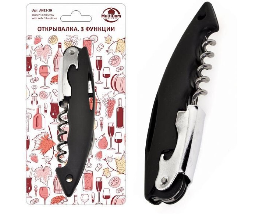 Наличие нескольких насадок определяют универсальность изделия: его можно использовать для открывания бутылок как с крышками, так и с пробками, а также банок. Складное лезвие изогнутой формы позволяет легко срезать защитную пробку из пластика. Такая многофункциональная открывалка является незаменимым помощником на кухне и в поездке.Изготовлено: рабочая часть из металла, накладные элементы из пластмассы.
