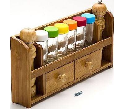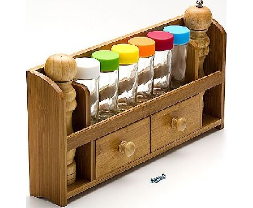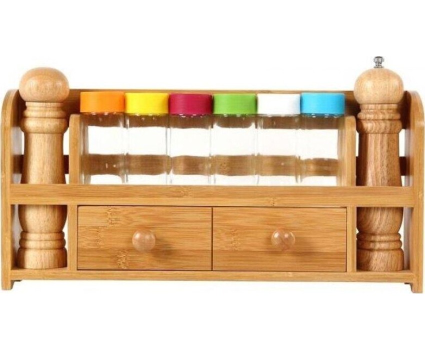 Набор для специй на подставке MAYER&BOSH — это небольшой набор с 6 емкостями для хранения разных по типу специй: тертый кориандр, черный перец, соль и прочее и двумя перцемолками, изготовленными из бамбука. Этот набор обязательно станет полезным дополнением на столе. Деревянный корпус изделия оригинально смоделирован, отличается превосходным дизайном. Баночки для специй в наборе имеют одинаковый размер и плотно закрывающиеся крышки.