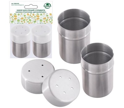 С набором для специй соль и перец всегда будут под рукой во время приготовления и приема пищи. Минималистичный дизайн набора украсит любую кухню, а также будут отличными помощниками в путешествии или на пикнике. Конструкция изделия максимально проста — вы открываете емкость помещаете внутрь соль, перец или любую другую приправу, затем плотно закрываете крышку. Дополнительная пластиковая крышка предотвратит рассыпание специй. Изготовлено: корпус и крышка изделия из коррозионностойкой (нержавеющей) стали, дополнительная крышка из пластмассы (полиэтилен). Диаметр 4 см, высота 6,4 см.