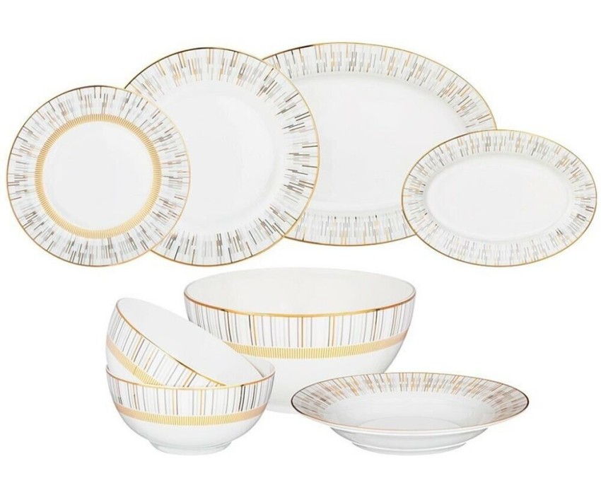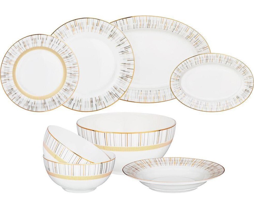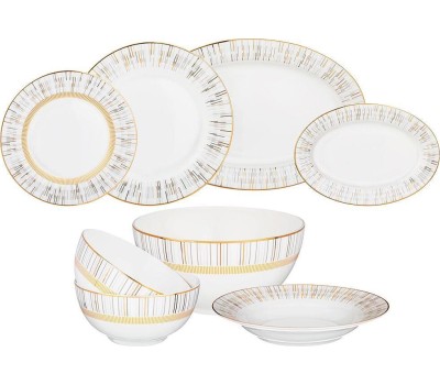 Комплектность: тарелка обеденная 25,5 см 6 шт., тарелка закусочная 20,5 см 6 шт., тарелка суповая 23 см 6 шт., салатник 23 см 1750 мл, салатник 16 см 750 мл 2 шт., блюдо овальное 36 см. блюдо овальное 23 см.