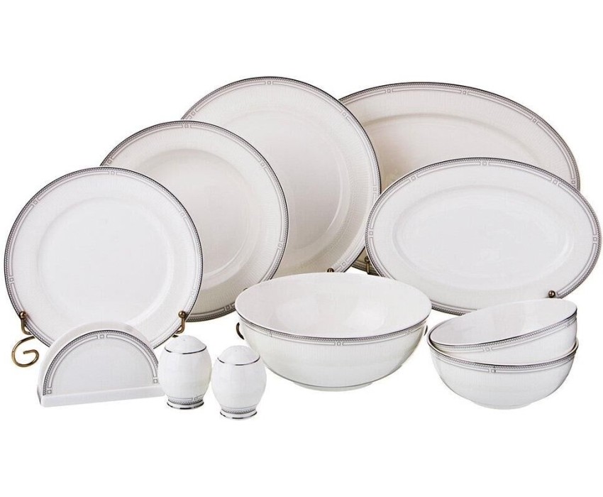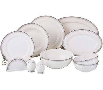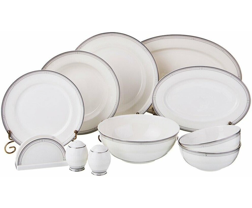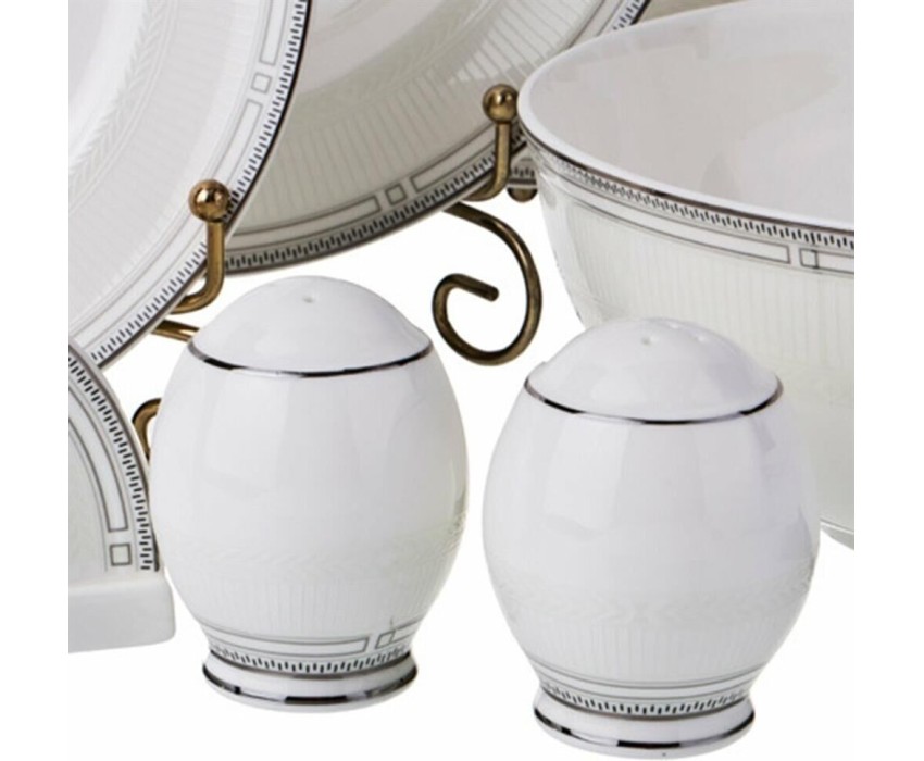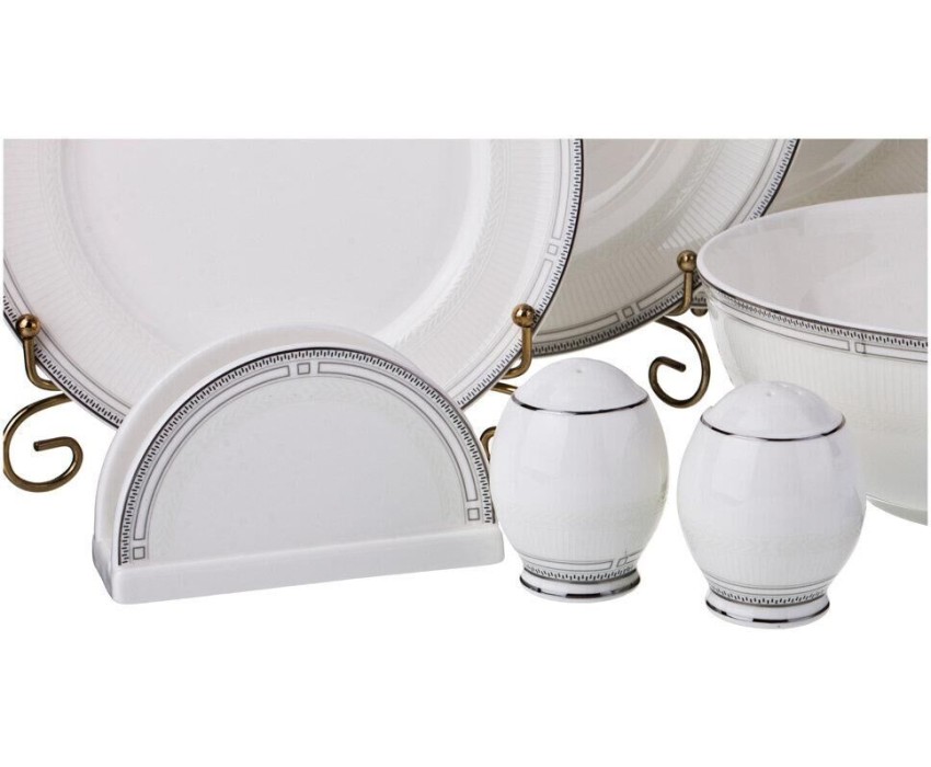Комплектность: тарелка обеденная 6 шт., тарелка суповая 6 шт., тарелка закусочная 6 шт., блюдо овальное 2 шт., салатник большой, салатник малый 2 шт., салфетница, соль, перец
