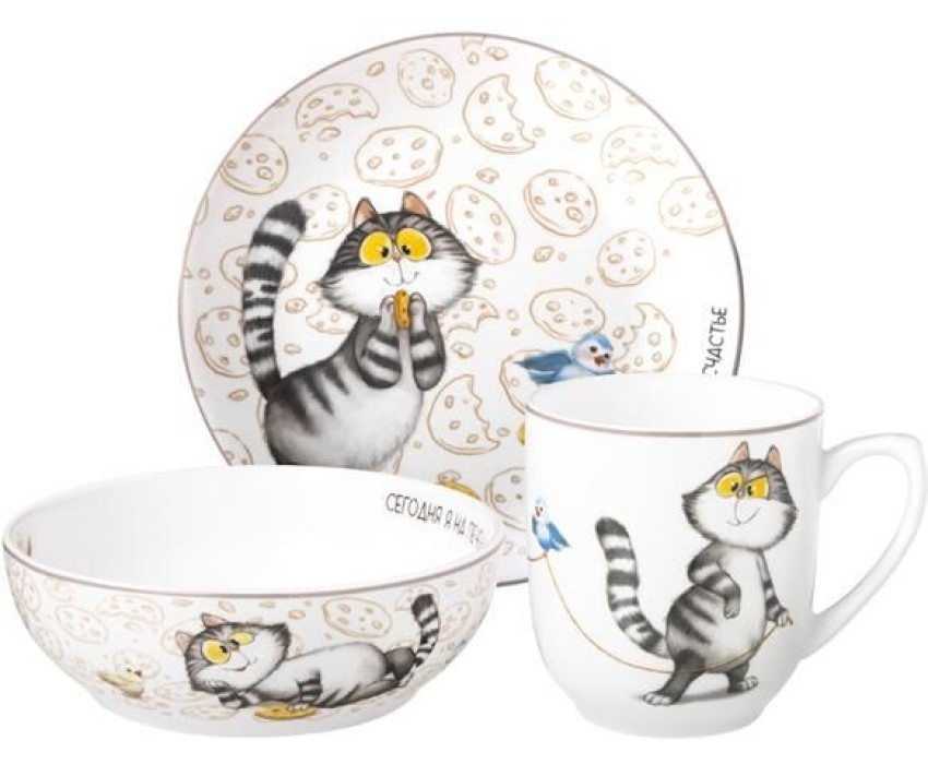 Всем, кто полон энергии и задора, любит кофе и следит за фигурой посвящается коллекция «Счастье есть» от ТМ LEFARD. Это лучший подарок детям, родителям, друзьям и коллегам. Поднимайте настроение вместе с веселым котиком, верьте, Счастье есть! Кружки, наборы посуды, салатники, закусочные и обеденные тарелки выполнены из высококачественного фарфора. Удобные формы и размеры. Красочная упаковка. Продукция прошла сертификацию, безопасна для контакта с пищевыми продуктами. Можно использовать в микроволновой печи, мыть в посудомоечной машине.