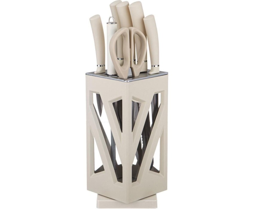 Состав набора: Нож поварской 20см, Нож для нарезки 20см, Нож для хлеба 20см, Нож универсальный 12,5см, Нож для чистки овощей и фруктов, 9см, Мусат, Ножницы для птицы, Вращающаяся подставка.