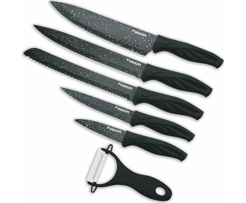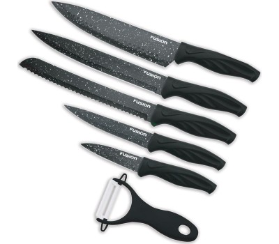 Набор кухонных ножей из 6 предметов: Шеф-нож, Нож для хлеба, Нож для нарезки, Универсальный нож, Нож для чистки овощей, Керамическая овощечистка. Специализированная японская сталь для ножей 420J2 . Твердость стали по шкале Роквела 52±2 HRC. Двусторонняя заточка лезвий. Угол заточки лезвий 15°. Легкое восстановление остроты ножей даже бытовыми ножеточками. Дополнительное декоративное покрытие с антикоррозийным эффектом. Эргономичная пластиковая ручка . Упаковка с пластиковым ложементом сохраняет заточку ножи при транспортировке.