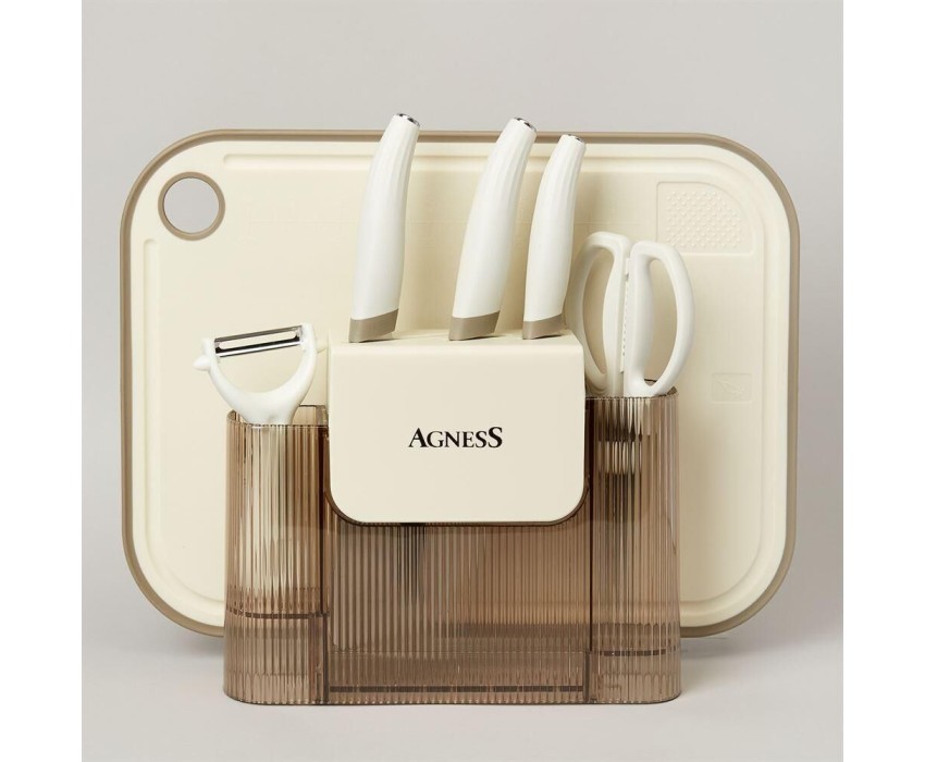Нож - главный инструмент на кухне, а вернее ножи, т.к. даже самый лучший нож не сможет справиться со всем многообразием задач. Выбирая набор кухонных предметов AGNESS - Вы приобретаете комплект самых необходимых и чаще всего используемых ножей, ножницы разделочную доску и тёрку.