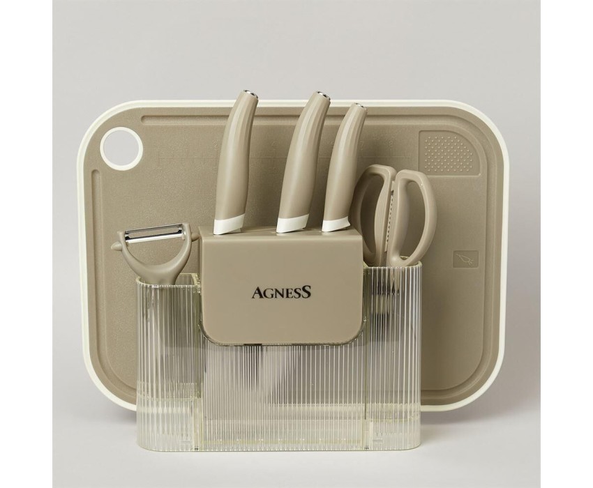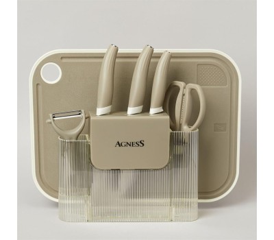 Нож - главный инструмент на кухне, а вернее ножи, т.к. даже самый лучший нож не сможет справиться со всем многообразием задач. Выбирая набор кухонных предметов AGNESS - Вы приобретаете комплект самых необходимых и чаще всего используемых ножей, ножницы разделочную доску и тёрку.