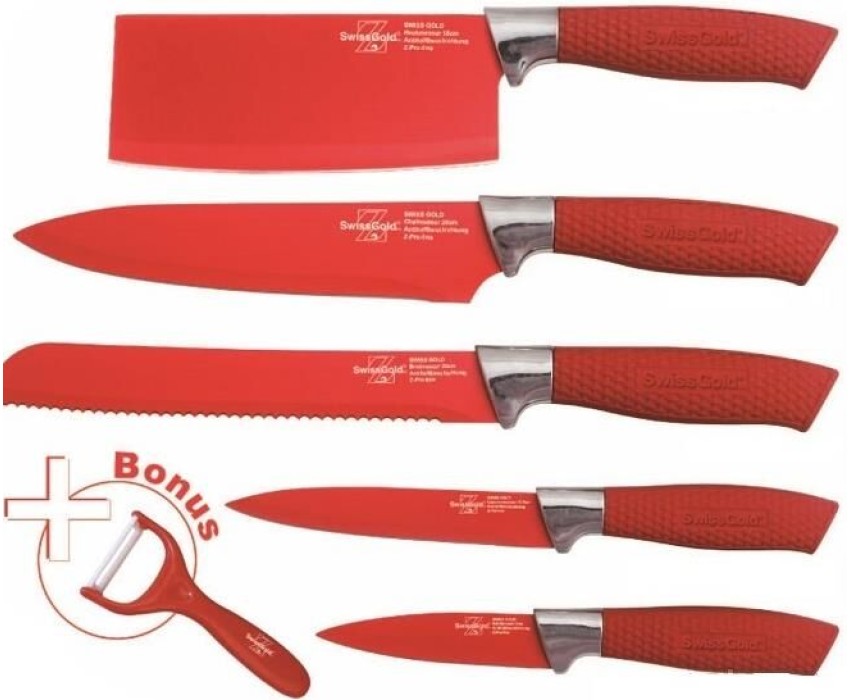 Набор ножей 6 предметов. Нержавеющая сталь. Нож для чистки овощей 9см. Нож универсальный 12.5 см. Кухонный топорик 18 см. Нож поварской 20см. Нож для хлеба 20 см. Овощечистка керамическая. Цвет красный
