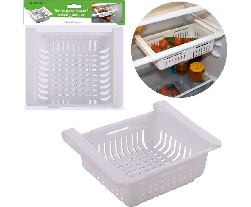 Лоток раздвижной в холодильник VL80-168 Материал: Пластмасса (РР) Размеры: минимальный размер 20,5х16,3х7,5 см, максимальный размер 28,5х16,3х7,5см.
