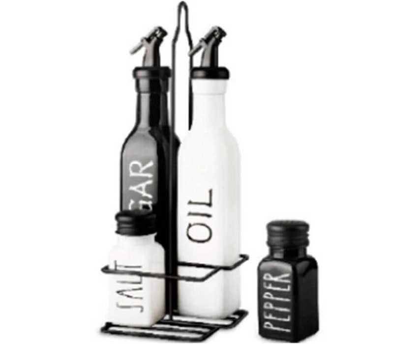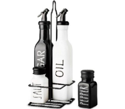 Набор для сервировки из 5 предметов INSALATO: 2 ёмкости для специй (по 80 мл), 2 бутылки для масла и уксуса/жидких соусов ( по 500 мл), подставка с подвесом. Общий размер набора: 12*11*34 см. Материал: натрий-кальций-силикатное стекло, металл, полипропилен, силикон. Индив упаковка: термоусадка + стикер.