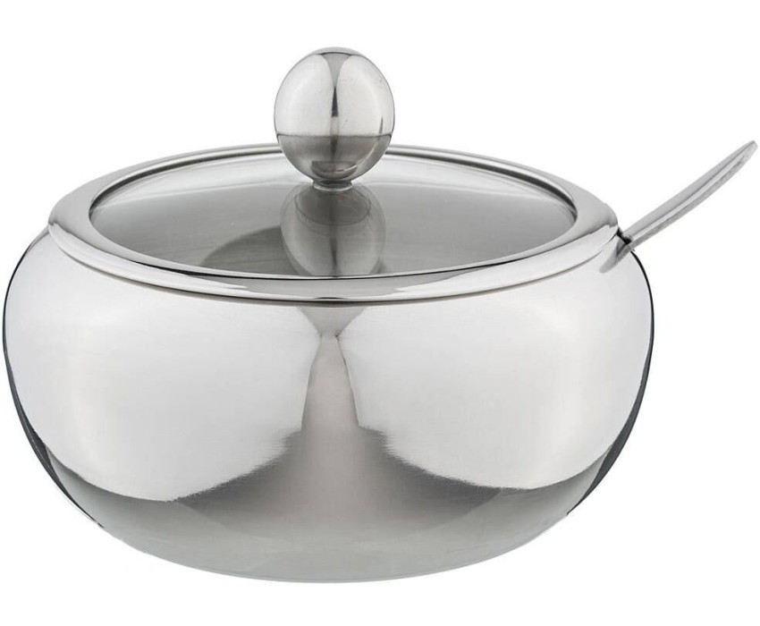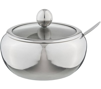 Сахарница выполнена из нержавеющей стали, имеет прозрачную крышку, сквозь которую видно количество содержимого, и ложечку для насыпания, которая располагается в выемке на корпусе сахарницы.