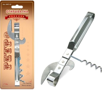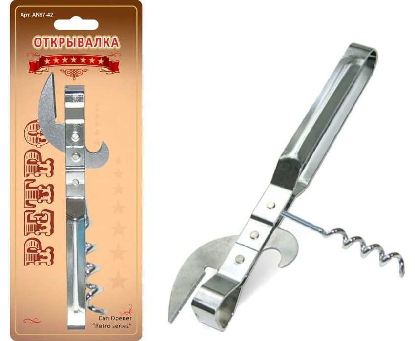 Модель универсальной открывалки знакома всем с детства. Кухонная классика в ретро-концепции станет незаменимым помощником для открывания консервных банок и бутылок. Приспособление не имеет сложных механизмов, его практически невозможно сломать или повредить. Преимущество модели в наличии штопора, который складывается и убирается в специальный отсек. Пользоваться изделием просто: приготовьте банку и поставьте ее на стол; возьмите открывалку и поставьте острым концом на край крышки; одной рукой держите нож за ручку, другой ударьте, чтобы получилась дырка; центральной частью держитесь за бортик банки, острием прорезайте металл по кругу; крышку осторожно отогните руками. Для бутылок используйте маленькое закругленное лезвие, цепляйте им за край крышки и аккуратно дергайте наверх. Лезвия и корпус изготовлены из стали с хромированным покрытием. Открывалка для консервных банок не нуждается в особом уходе, после использования достаточно промыть проточной водой и высушить.