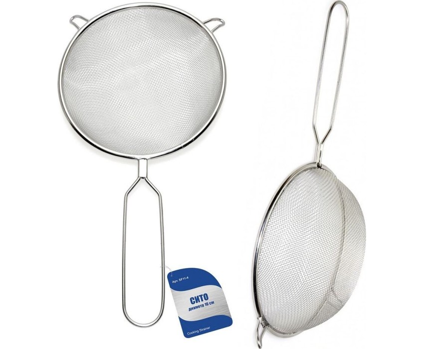 Сито – это простое и нужное приспособление, которое понадобится в каждом доме. Изделие используется для промывания овощей, фруктов, ягод, процеживания компотов, травяных отваров и слива макарон. Сито изготовлено из нержавеющей стали, состоит из металлической сетки, ободка и ручки. Ручка удобна не только во время использования сита, но и для размещения его на крючке. На ободке есть петельки, фиксирующие инструмент на посуде — кастрюлях, пиалах, мисках. Материал отличается долговечностью, не вступает в реакцию с продуктами питания, не деформируется со временем. После использования промыть изделие с моющим средством. Диаметр 16 см.