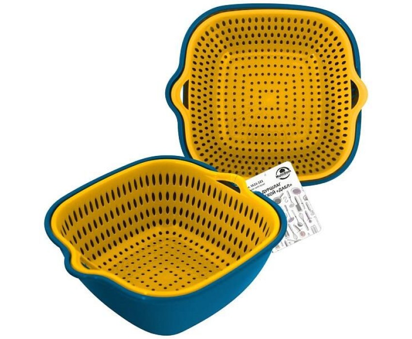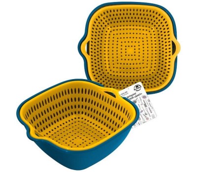 Дуршлаг с миской — удобное многофункциональное изделие, необходимое на любой кухне. Дуршлаг может использоваться для промывания фруктов, сухофруктов, овощей и зелени, а также для слива макаронных изделий, вареного картофеля и других продуктов. Миска подойдет для сушки — промойте продукты и поместите дуршлаг в емкость, чтобы лишняя вода не стекала на стол. Приспособление удобно для размораживания мяса и рыбы. Миска также может использоваться самостоятельно — в ней можно приготовить салат, подать фрукты и овощи на стол и т.п. Изготовлено: пластмасса (полипропилен). Размеры: дуршлаг - 19х17х7,5 см; миска – 19,5х18х8см, емкость 1200мл.