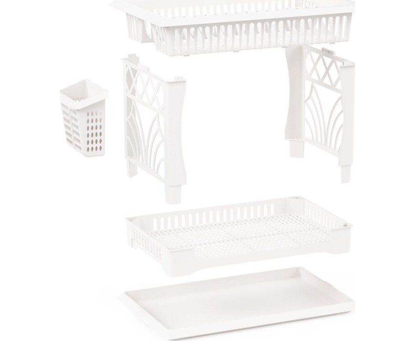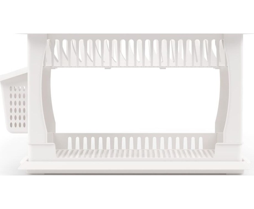 Изделие предназначено для сушки кухонной утвари. Верхний ярус позволяет размещать тарелки, а нижний ярус – чашки или другую глубокую посуду. На боковой стойке, соединяющей два яруса, располагается специальный карман для сушки столовых приборов. Поддон позволяет собрать стекающие капли и защитить поверхность стола от влаги. Вес 1 кг Размеры изделия (ДхШхВ) 480х305х300 мм