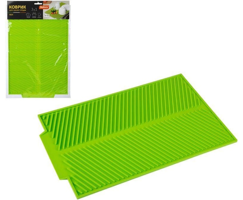 Силиконовый коврик для сушки посуды 3 в 1: коврик для сушки, подставка под горячее, прихватка Благодаря ребристой поверхности вода стекает в желобки, оставляя посуду сухой. Занимает минимум места на рабочей поверхности. Размеры: 39*25 см Материал: силикон цвет: зеленый