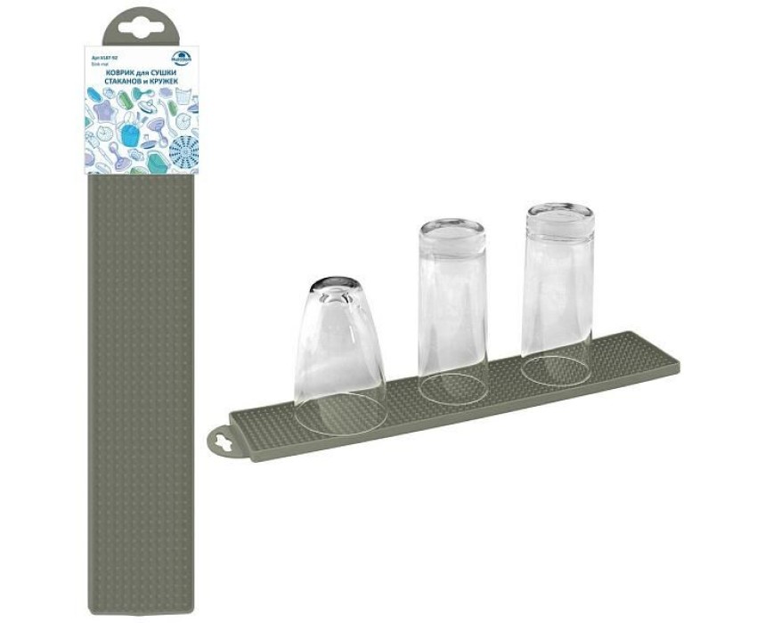 Коврик предназначен для сушки стаканов, кружек, столовых приборов и другого небольшого кухонного инвентаря. Положите коврик на край кухонной мойки, поставьте на него кружки и стаканы горлышком вниз. Лишняя влага стечет и посуда будет чистой и сухой. Специальная перфорация предотвратит запотевание стаканов. Благодаря специальному отверстию, коврик можно подвесить на крючок для просушки. Перед первым и после каждого применения, промыть в теплой воде, можно с жидким моющим средством, сполоснуть проточной водой и просушить. Можно мыть в посудомоечной машине. Изготовлено из TPR. Размер: 45*8*1см.
