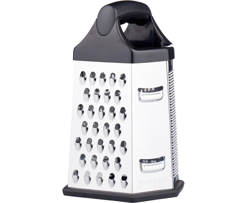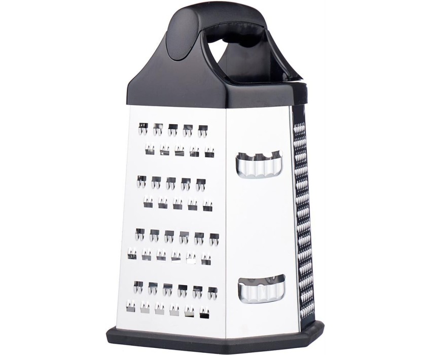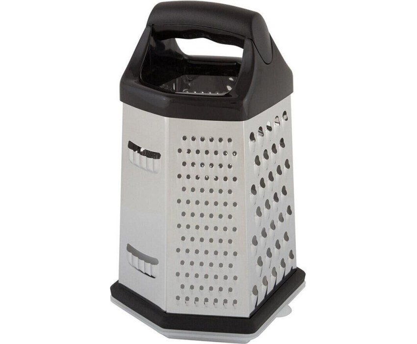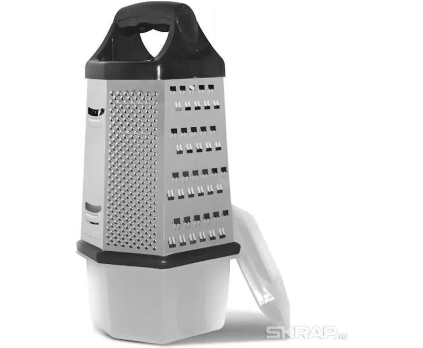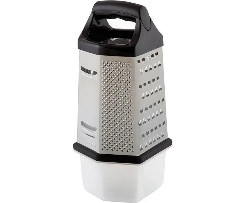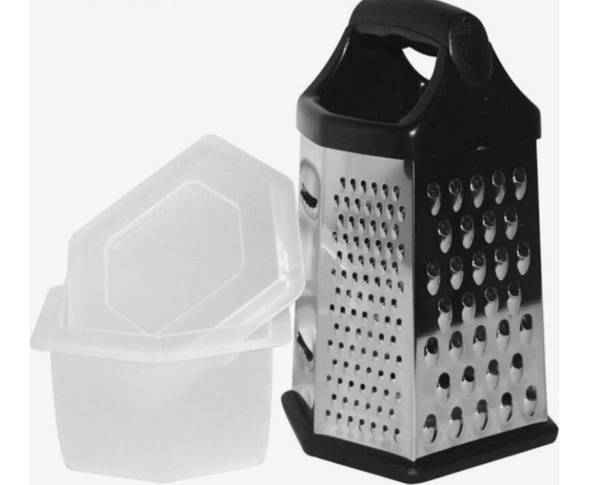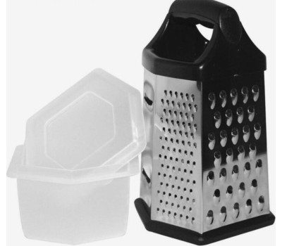 Терка 6-ти гранная, с контейнером Высота: 20 см толщина стали 0,25 мм Материал: нержавеющая сталь, ABS пластмасса, ТПР, полипропилен. Упаковка — инд цветная коробка. Толщина стали 0,25 мм