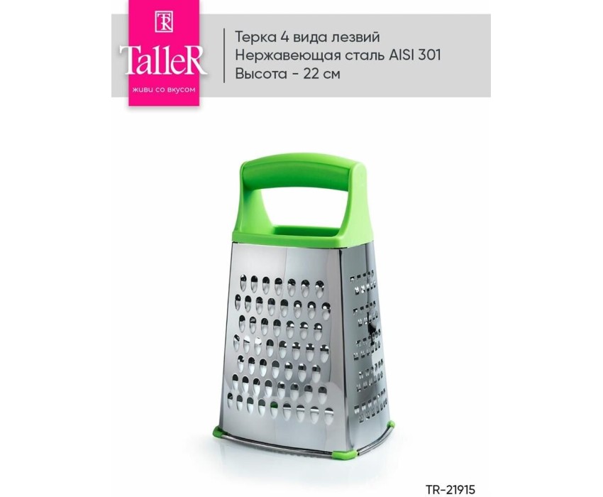 Терка "Эмма" 4 в 1 Размеры 14,7*11,5*22 см Ручка удобной формы не выскальзывает из рук даже при намокании. Нескользящие силиконовые протекторы на основании предотвращают скольжение во время использования и защищют поверхность от повреждений.