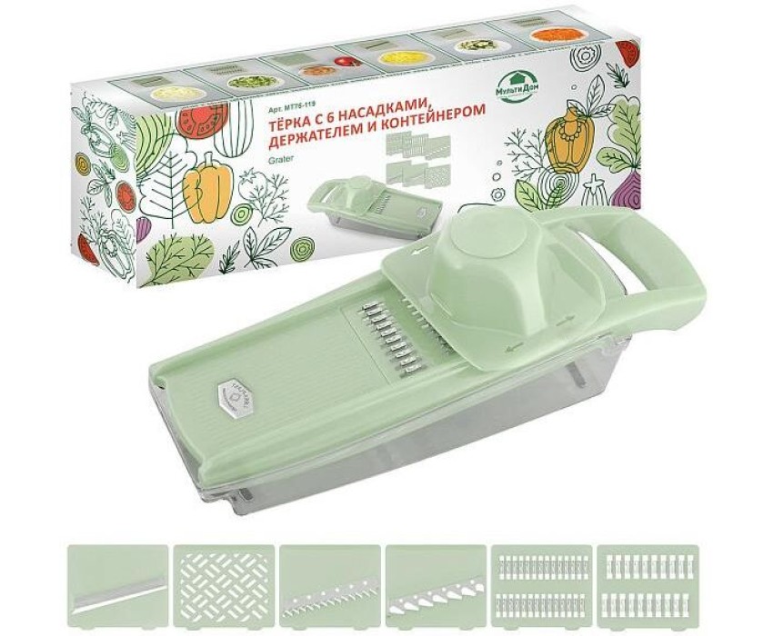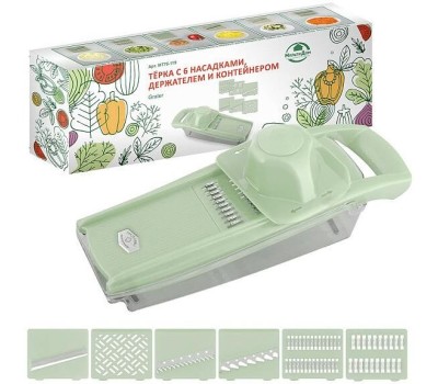 Терка - универсальное кухонное приспособление, которое сэкономит ваше время. С ее помощью вы легко сможете измельчить овощи и фрукты: морковь по-корейски, нашинковать капусту, натереть в пюре яблоко, нарезать картошку и многое другое. Все измельченные продукты будут собираться в контейнере, что позволит сохранить рабочее место на кухне в чистоте и порядке. В комплект входит: 1. Корпус терки с отверстием, куда вставляются насадки. 2. Держатель-толкатель, который посредством 4-х металлических стержней удерживает овощи под пластиковым колпаком – предохранителем, не допуская непосредственного контакта рук с режущими элементами терки. 3. Пластиковый контейнер для нарезанных овощей и фруктов. Также может использоваться для хранения насадок и держателей внутри. 4. Шесть насадок: 5 из пластмассы с металлическими ножами-вставками, 1 насадка из пластмассы (для фруктовых пюре и овощных смесей). Насадки предназначены: 1) для нарезания тонких ломтиков из овощей, фруктов и шинковки капусты, 2) для нарезки крупных и мелких брусочков из картофеля (картофель-фри), 3) для корейских салатов, нарезки моркови, свеклы, редьки, огурцов, 4) для приготовления нежных овощных смесей и сочных фруктовых пюре. Изготовлено: лезвия из коррозионностойкой (нержавеющей) стали, корпус тёрки из пластмассы (АБС), контейнер из пластмассы (полистирол).