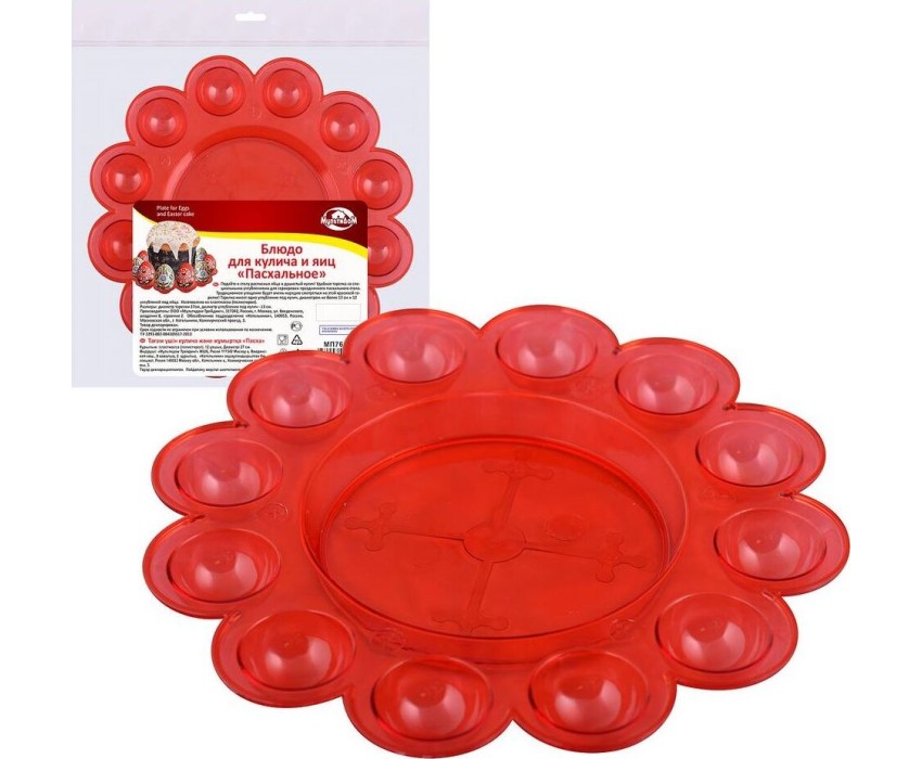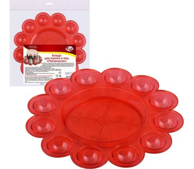 Подайте к пасхальному столу расписные яйца и свежеиспеченный кулич Удобная тарелка со специальными углублениями предназначена для сервировки праздничного обеда. Традиционное угощение будет очень нарядно смотреться на этой красивой тарелке. Блюдо имеет одно углубление под кулич, диаметром не более 13 см и 12 углублений под яйца. Изготовлено из пластмассы (полистирол) Размеры: диаметр тарелки 27 см, диаметр места для кулича - 13 см.