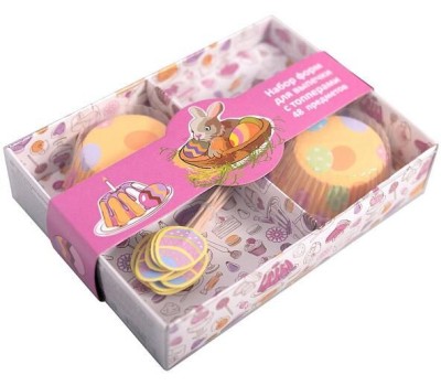 С помощью такого наборы Вы сможете не только испечь кексы в ярких бумажных формах, но и украсить готовую выпечку топперами с картинкой. Одноразовые бумажные формы для выпечки кексов, капкейков, маффинов, бисквитов и пирожных не нуждаются в смазывании маслом и могут использоваться как вместе с металлическими и силиконовыми формами, так и отдельно для декорирования уже готовых кексов. Просты в использовании: поместите бумажную форму в металлическую или силиконовую ячеистую форму, поместите тесто в бумажную форму и поставить в духовку. В набор входит: формы для выпечки – 24 шт; топперы с декором – 24 шт. Изготовлено: формочки из гофрированной бумаги, топперы из бумаги на деревянных палочках. Размер: диаметр (верх/низ) 7 см/5 см, высота бортика 3,5 см, высота топпера 8 см.