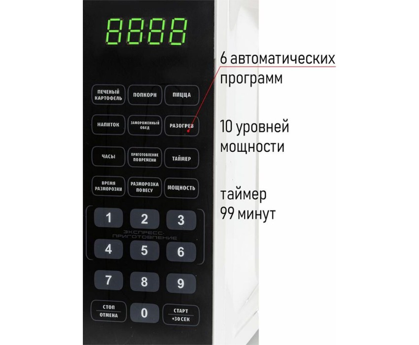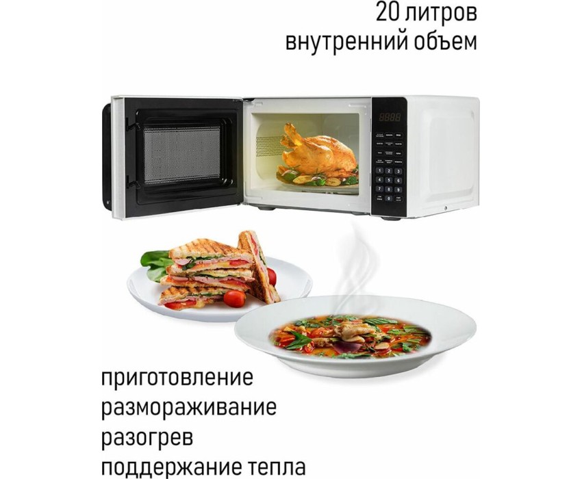 Печь микроволновая, объем 20л, выходная мощность 700 Вт, тип управления: сенсорная, 10 уровней мощности, 6 программ автоприготовления, разморозка по весу и времени, таймер на 99 минут, блокировка от детей, диаметр поворотного стола 245 мм, сигнал окончания приготовления.