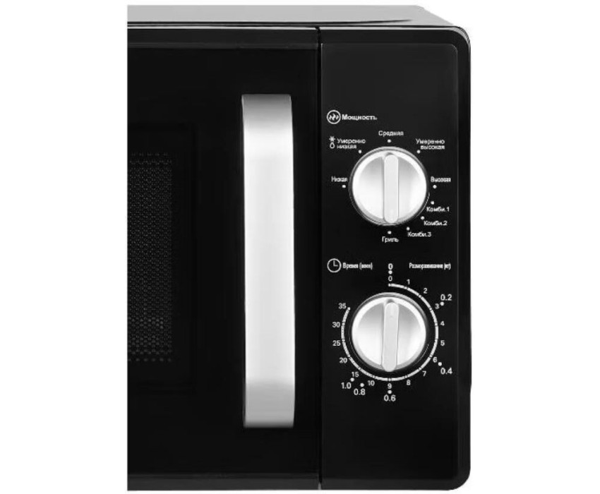 20 Литров, цвет - черный, мощность 700W, 5 режимов мощности, гриль, функция разморозки по весу, быстрый старт, таймер. механика. Внутренний размер (ВхШхГ) (мм) - 440х340х260 мм, . Вес (n/g) - 10,5