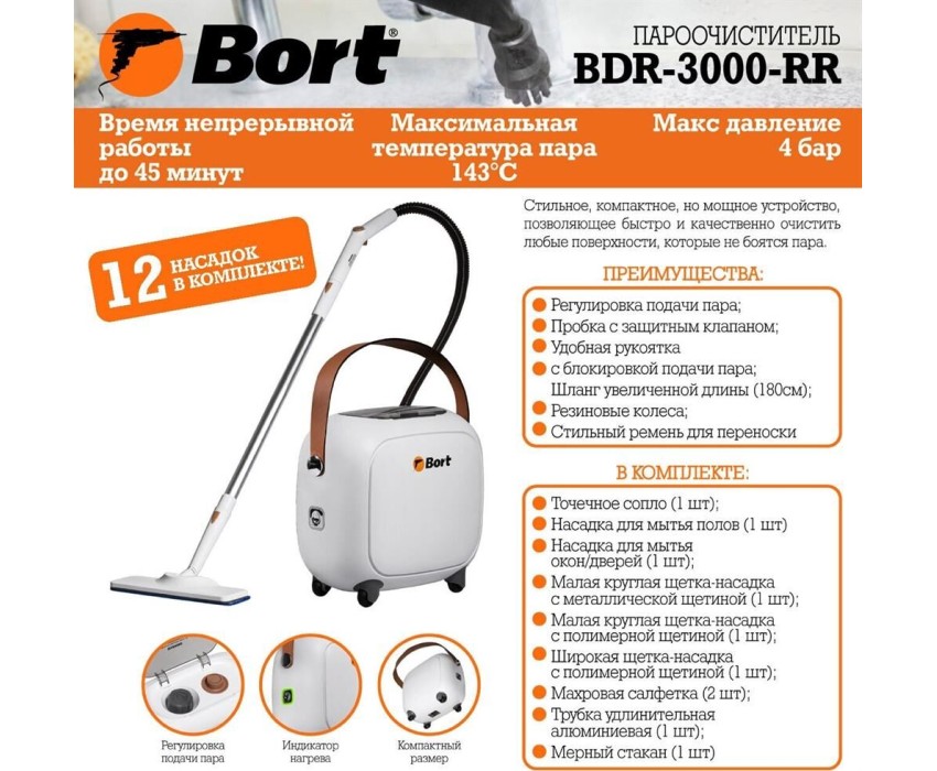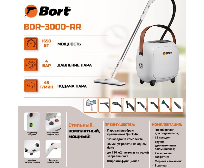 Мощность, Вт1 650. Напряжение, В220.Макс давление, бар 4.Частота тока, Гц50.Постоянная подача пара, г/мин 45.Вес изделия, кг3,8.Температура пара, °С143.Вес брутто, кг5,9.Емкость бачка, мл1,5.Габариты упаковки, см69 x 25 x 33. Время нагревания, с480.Время непрерывной работы, мин 45.Регулировка мощности пара Да. Длина шланга, м1,8. Длина шнура питания, м5.