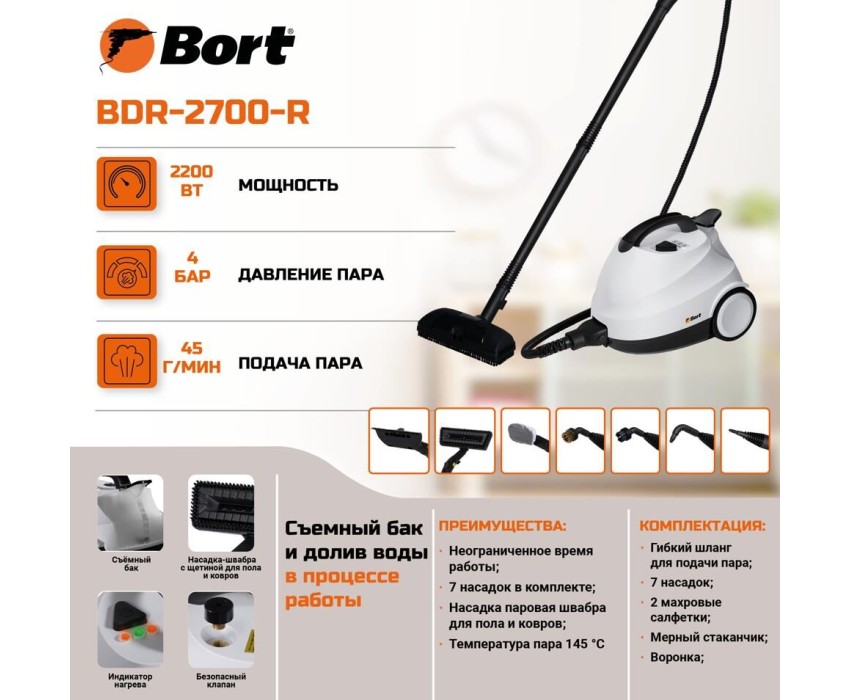 Автоматическое выключение: Да. Вертикальное отпаривание: Да. Вес брутто, кг: 8,72. Вес изделия, кг: 7,5. Вес нетто, кг: 8,72. Время нагревания, с: 360. Время непрерывной работы, мин: 35. Горизонтальное отпаривание: Да. Длина шланга, м: 2. Длина шнура питания, м: 3. Емкость бачка, мл: 1 200. Защита от перегрева: Да. Индикация низкого уровня воды: Да. Использование моющего средства: Нет. Конструкция: Напольный. Макс давление, бар: 4. Материал Корпуса: Пластик. Мощность, Вт: 2 200. Напряжение, В: 220. Объем бойлера, мл: 1 500. Отключение при недостатке воды: Да. Постоянная подача пара, г/мин: 45. Предохранительный клапан: Да. Размер, мм: 400x285x260. Регулировка мощности пара: Нет. Ручка для переноски: Да. Съемный резервуар для воды: Да. Температура пара, °С: 143. Частота тока, Гц: 50.