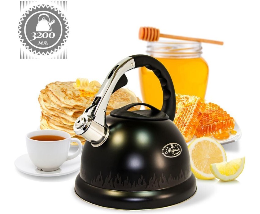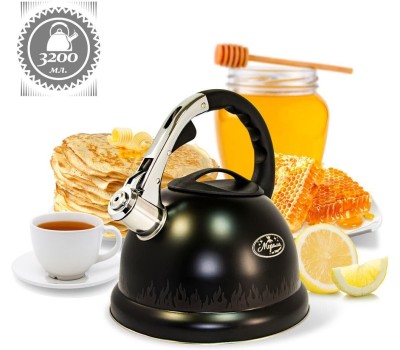 3,2 литровый чайник из нержавеющей стали со свистком.Ручка из литой стали с рычагом для открывания носика Толщина стенок: 0,35 мм. Дно капсульное:0,5 мм алюминий + 1,5 железо+0,5 алюминий Черная окраска корпуса с линией,меняющей цвет при нагревании