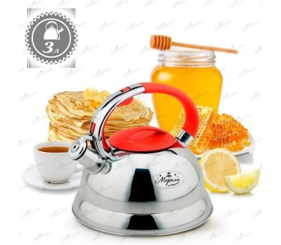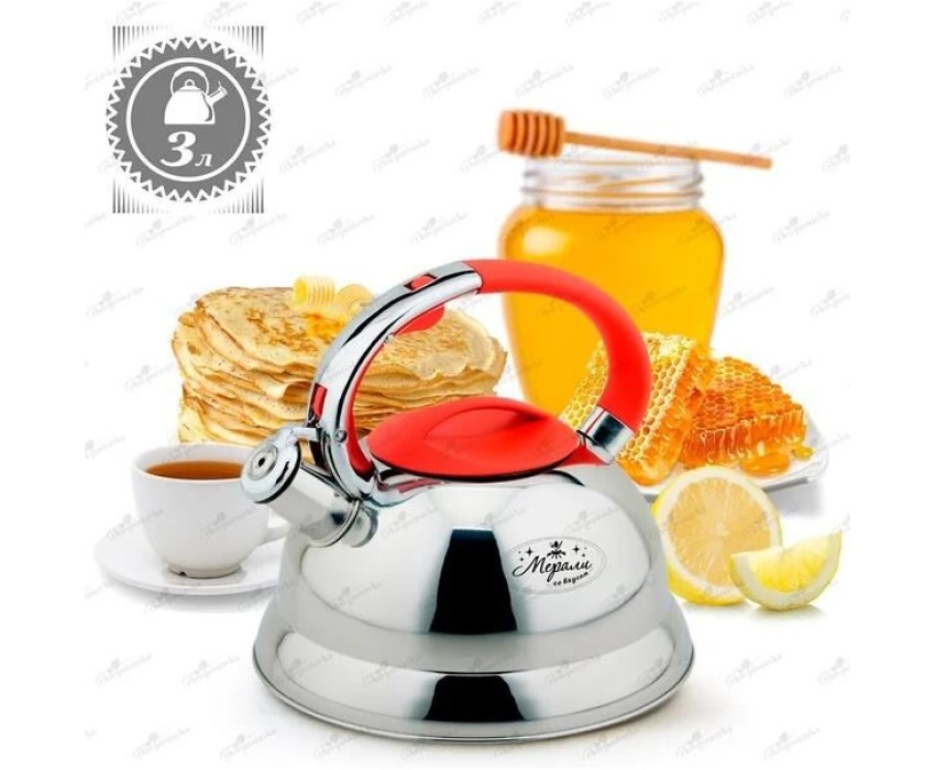 Чайник со свистком Мерали ЧН-30-09 3,0 литра Объем: 3 л. Материал: нержавеющая сталь. Класс стали: 201. Толщина стенок: 0,35 мм. Дно: капсульное 0,5мм алюминий +1,5 мм железа + 0,5 мм алюминий Полировка: зеркальная. Ручка: цинковый сплав + красное резиновое покрытие, с рычагом для открывания носика Лазерный логотип на корпусе