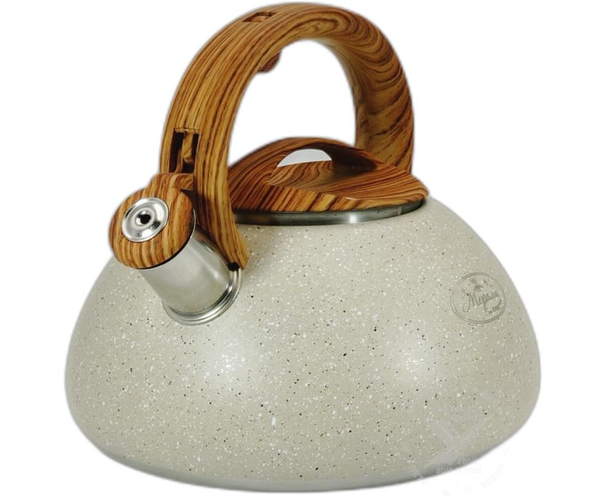 Чайник нержавеющий со свистком Мерали ЧН-30-14 3,0 литра Объем: 3,0 л Материал: нержавеющая сталь 201 класса (корпус) и 430 класса (дно) Толщина стенок: 0,6 мм Шарообразный бесшовный сварной корпус кремового цвета «под мрамор» Ручка из нейлона с прорезиненным покрытием «под дерево» с рычагом для открывания носика Однослойное дно Лазерный логотип на корпусе