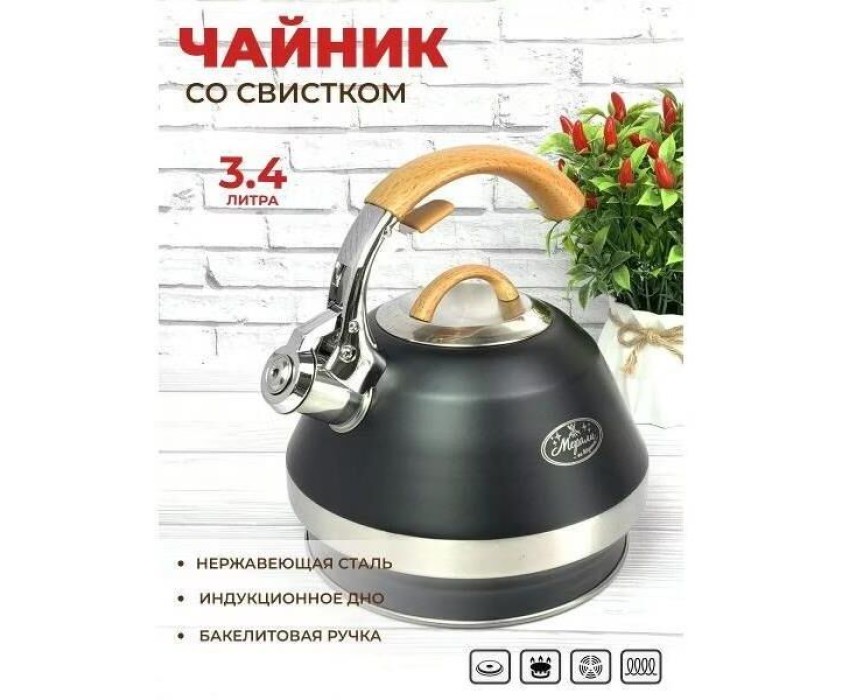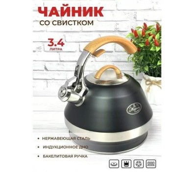 Чайник нержавеющий со свистком Мерали ЧН-34-02 Бренд Мерали Страна Россия Высота (мм) 235 Объём 3,4 л Материал Нержавеющая сталь/бакелит
