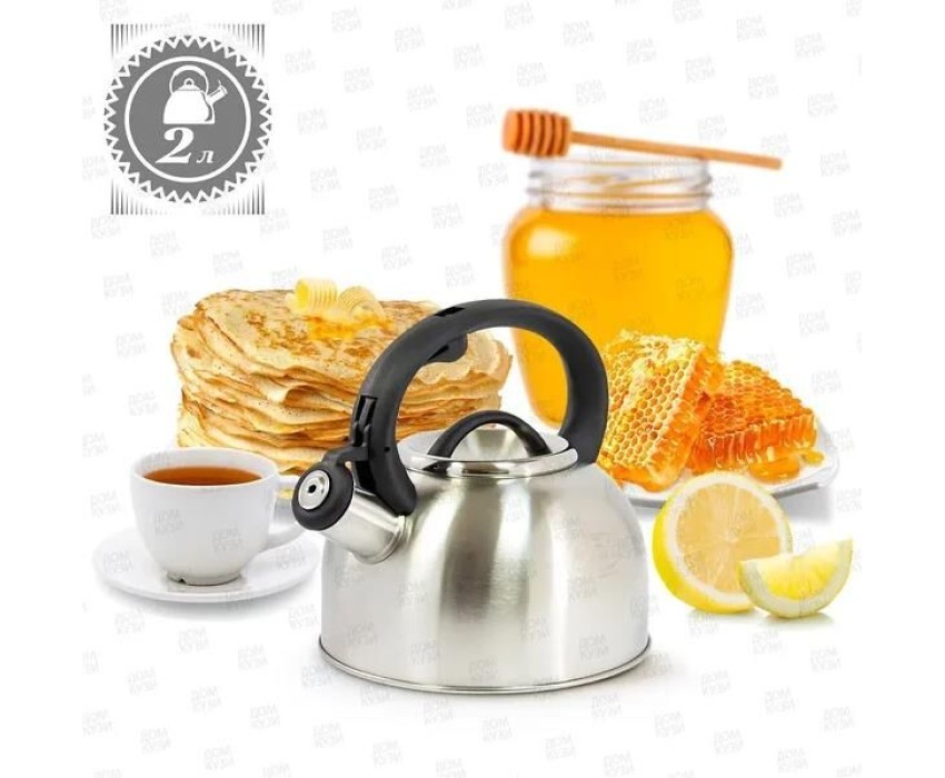 Чайник со свистком Мерали ЧН20-01 2,0 литра Объем: 2,0 л. Материал: нержавеющая сталь. Класс стали: 201. Толщина стенок: 0,3 мм. Дно: цельное Полировка: матовая Ручка: с рычагом для открывания носика. Лазерный логотип на корпусе согласно дизайну
