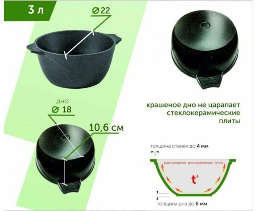 Кастрюля 3л со стеклянной крышкой. Антипригарное покрытие Greblon на водной основе без PFOA серии "Гранит star". Подходит для всех типов плит, кроме индукционных. Можно использовать в посудомоечной машине. Ресурс более 12 000 циклов, толщина покрытия до 55 мкр. Толщина дна 5,5-6мм., толщина стенок 3,6-4мм. Покрытие Greblon позволяет готовить с минимальным количеством масла, сохраняя вкусовые и полезные свойства продуктов. Литой толстостенный корпус не подвержен деформации, а утолщенное дно равномерно распределяет тепло по всей поверхности.