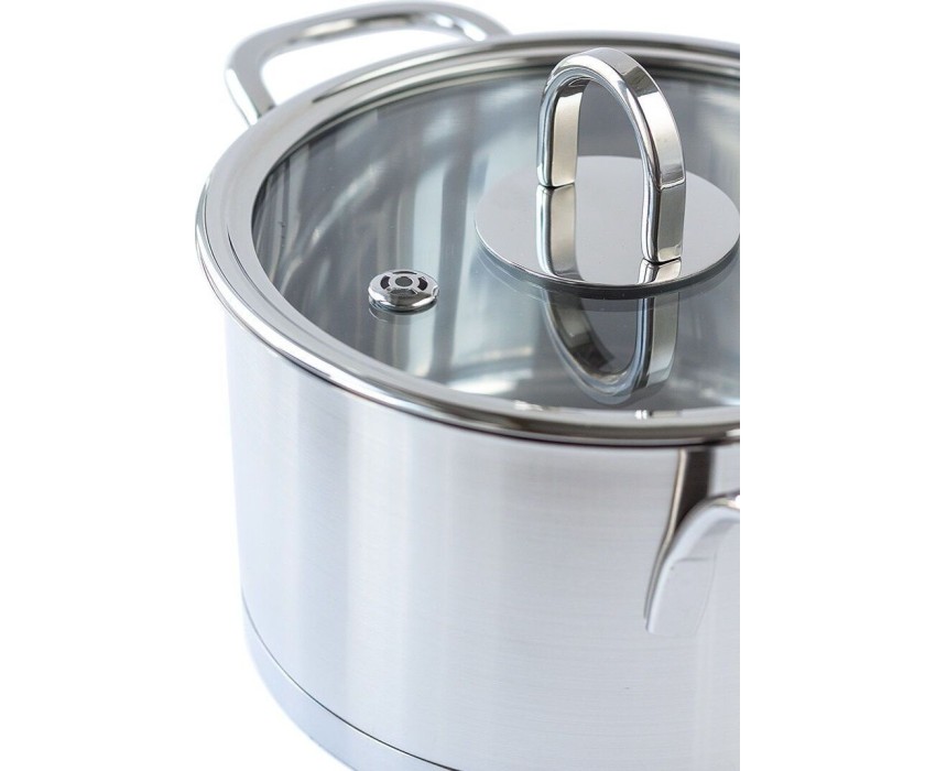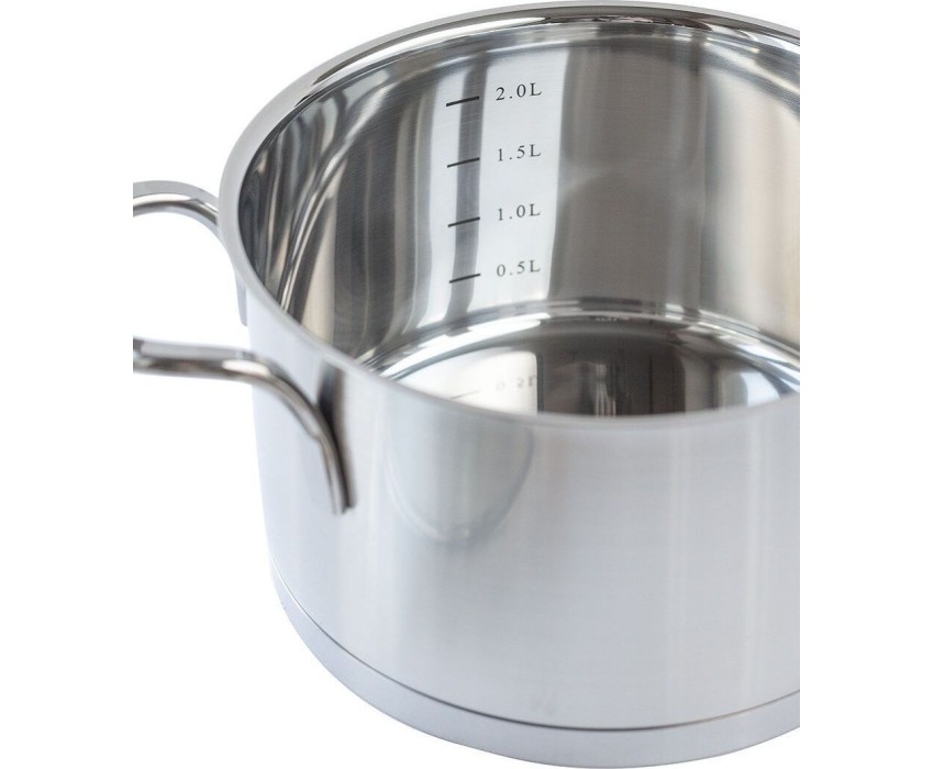 Из нержавеющей стали 18/10, подходит для использования в ПММ. Теплоемкое капсульное дно. Стеклянная крышка в комплекте. Подходит для всех типов плит. Мерная шкала на внутренней стенке